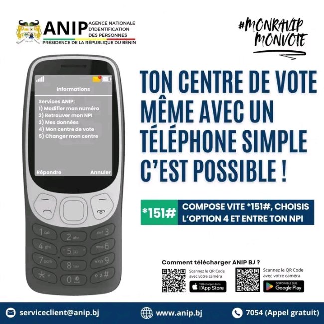 Dans un message publié sur sa page Facebook, l’ANIP rappelle aux électeurs qu’ils peuvent consulter leur centre de vote et identifier leur poste de vote directement depuis leur téléphone portable. Pour ce faire, il suffit de composer le code *151*4#, puis d’entrer son Numéro personnel d’identification (NPI). Une démarche simple et accessible à tous.